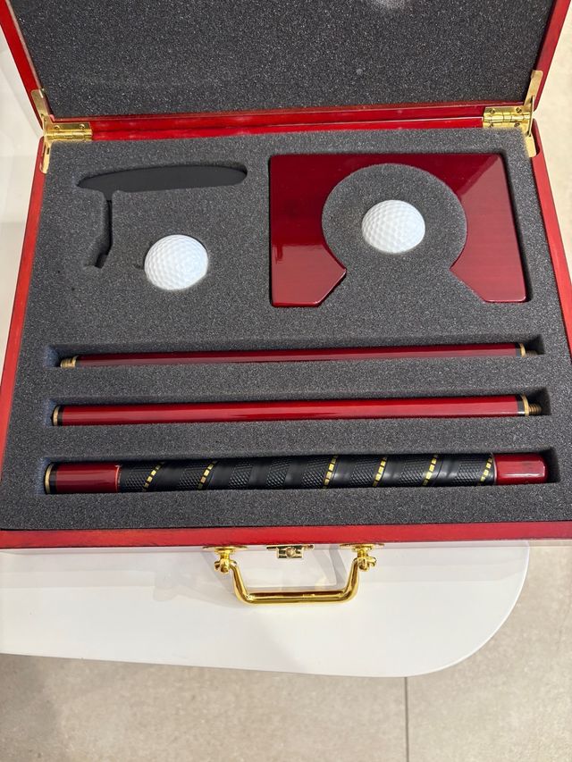 Detalles del productoJuego de mini golf portátil en estuche de madera. Incluye putter desmontable, dos bolas y un hoyo. El estuche es de color rojo y tiene un asa dorada. Los palos son de madera y tienen un diseño elegante. Perfecto para llevar a cualquier parte.