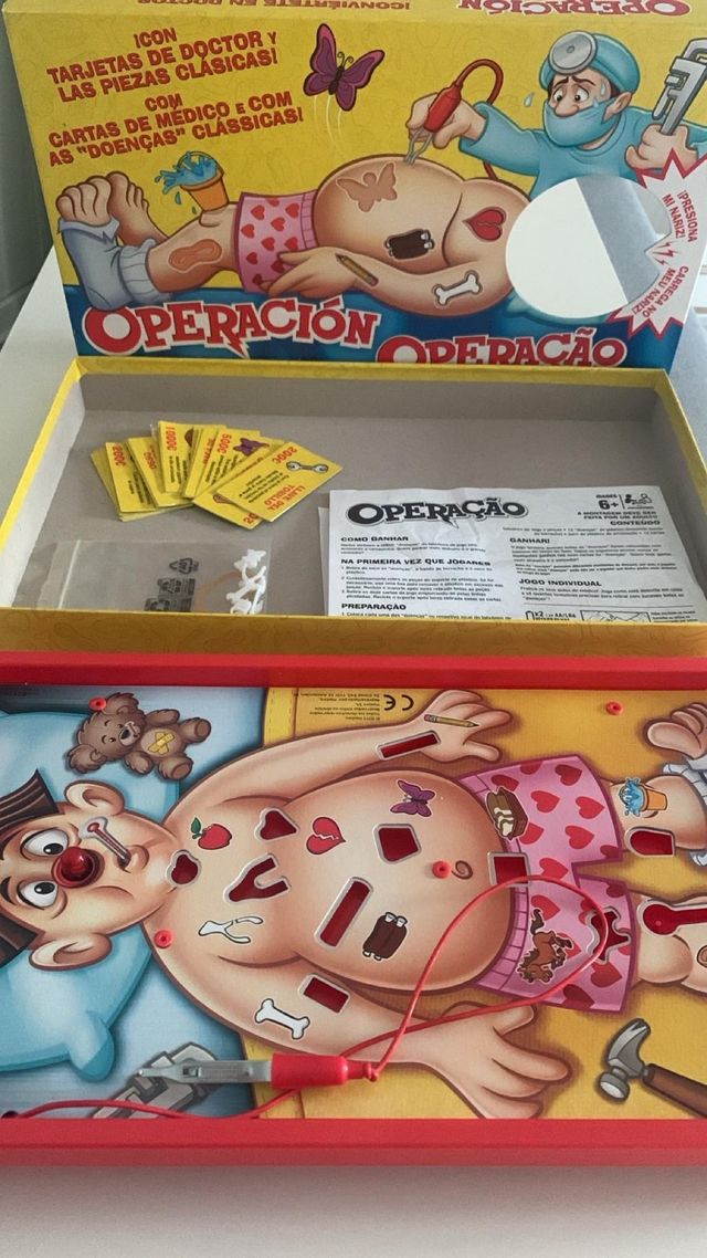 Juego de mesa Operación, versión clásica. - Incluye tarjetas de doctor y piezas. - Contiene cartas de médico y dolencias clásicas.