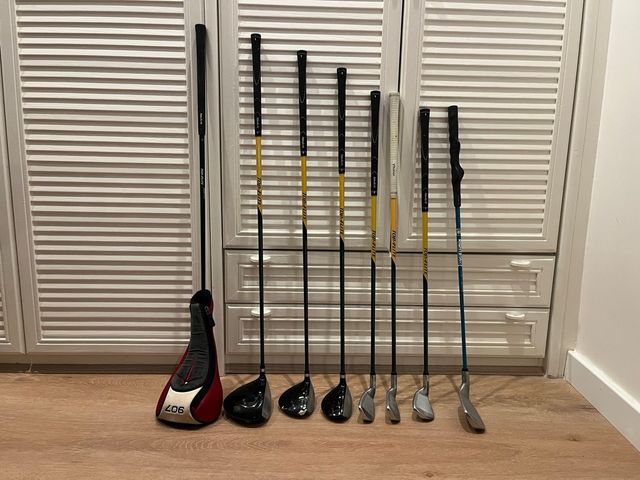 Detalles del productoJuego de palos de golf Top Flight para jóvenes, en buen estado. Incluye 7 piezas: driver, maderas 3 y 5, hierros 7, 9 y Pitching Wedge, y putter. Ideales para principiantes. Los palos presentan algunos pequeños signos de uso.