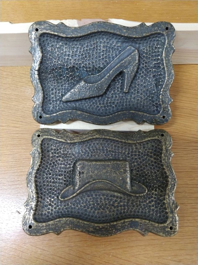 Detalles del productoPlacas señalización baños WC en latón patinado envejecido. ancho de placa 190mmx alto 130mmx grueso 8mm.#643699900. precio juego de las 2 placas.