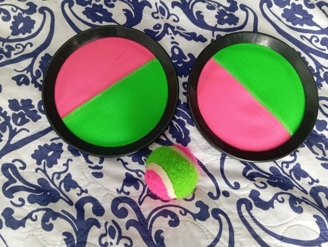 Set de raquetas de velcro con pelota para jugar. - Incluye dos raquetas. - Una pelota. - Diseño de dos colores en las raquetas: rosa y verde.