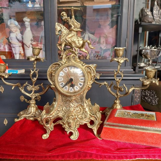 Detalles del productoPrecioso juego de reloj de sobremesa y candelabros a juego, ambos fabricados en bronce con un diseño clásico y ornamentado.