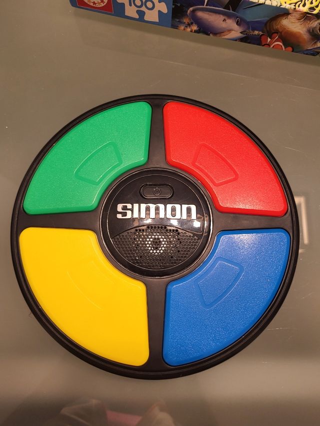 Juego de memoria Simon. - Cuatro botones de colores: rojo, verde, amarillo y azul. - Diseño circular. - Botón de encendido/apagado en el centro.