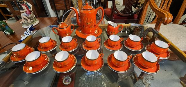 Juego de Te de 12 servicios, tetera, azucarero, lechara y plato de presentación, en total 28 piezas de Moriyama, sello Mori China, porcelana de cascara de huevo con Litofania de Geisha.