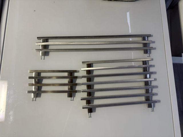 Detalles del productoConjunto de tiradores de metal para puertas o muebles. Son de estilo moderno y acabado cepillado.
