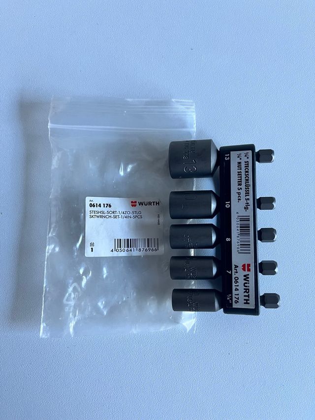 Set de 5 vasos hexagonales imantados de la marca Würth. Calidad de primera. - Medida: 1/4 - Incluye vasos de 1/4”, 7, 8, 10, 13 mm.