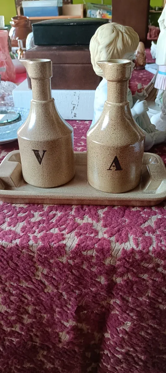 Conjunto de dos vinagreras y una bandeja.ceramica de Valdemorillo. 15 cm de alto .bandeja 23 x 12 - Vinagreras de cerámica con letras V y A. - Bandeja a juego.