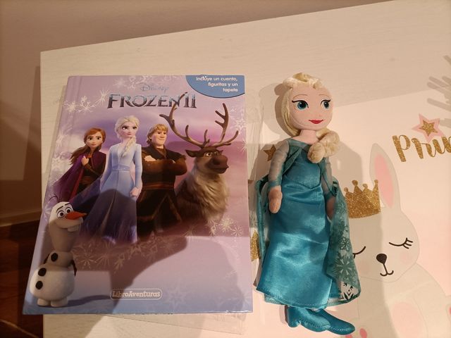 muñeca de Frozen blandita y juego, con todas.las.figuras de Frozen y cuento para escenificar