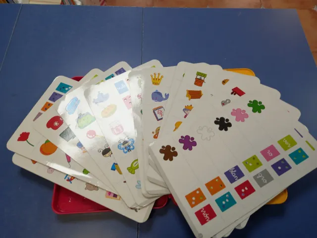 Juego educativo para aprender las sílabas. Incluye varias tarjetas con dibujos y palabras. - Tarjetas con imágenes y letras. - Fomenta el aprendizaje de la lectura.