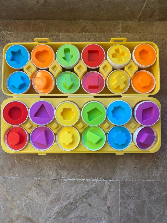 Detalles del productoSet de 12 huevos de plástico con formas y colores variados para que los niños aprendan jugando.