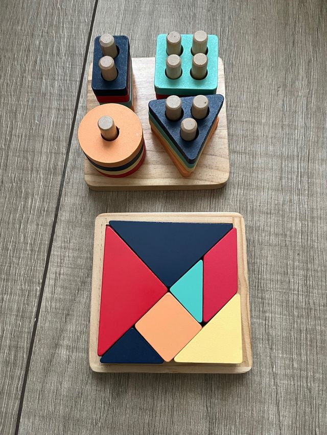 Detalles del productoSet de juegos de madera para niños pequeños, ideal para desarrollar habilidades motoras finas y reconocimiento de formas.