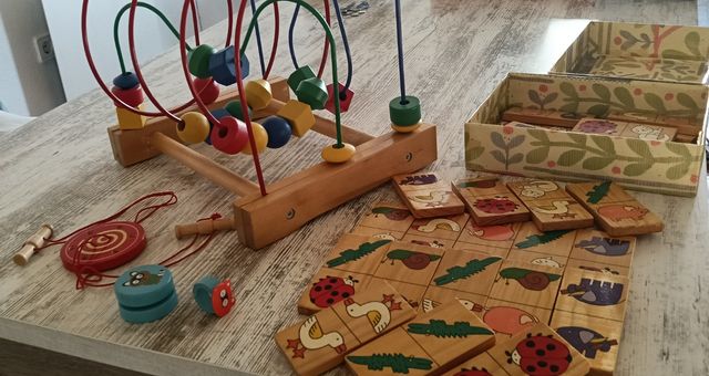 Juegos infantiles madera: dominó, laberinto, yo-yo