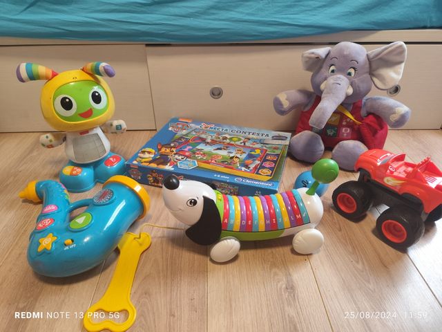 Detalles del productoJuguetes electronicos, menos el coche, el elefante interactua con el raton y su barriguita en catalan, todos funcionan, al juego de la patrulla canina le falta una ficha, tiene actividades por las dos caras, el perrito tiene canciones y palabtas del abecedario.