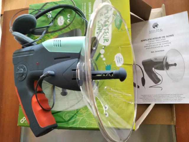 Detalles del productoAmplificador de sonidos de la marca Nature & Découvertes, con auriculares incluidos. El dispositivo tiene un diseño ergonómico y un plato recolector de sonido.