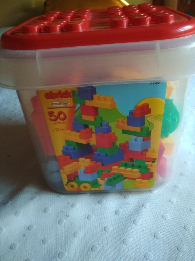 caja grande con moldes para construcciones con piezas grandes fácil de guardar y recoger en la propia caja que también sirve de taburete