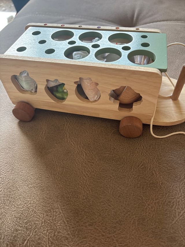 Juguete de madera con formas para encajar. - Fabricado en madera. - Incluye varias piezas con diferentes formas. - Diseño tipo coche con ruedas.
