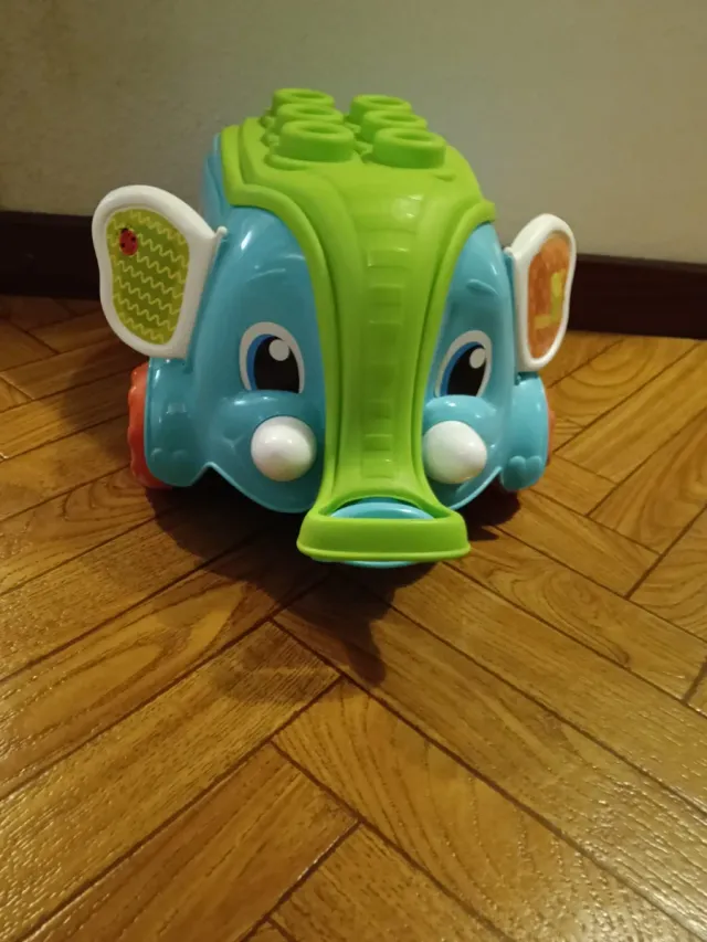 Divertido juguete apilable con forma de elefante. - Diseño colorido en azul y verde. - Ruedas para moverlo.