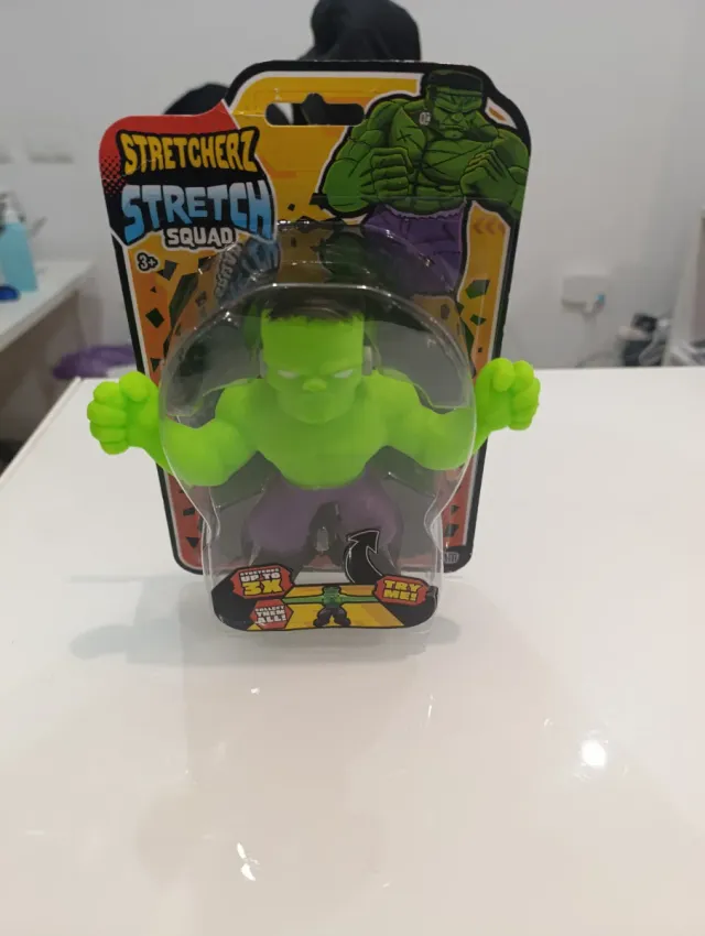 Figura de Hulk de la línea Stretch Squad. Es un juguete elástico. - Color verde y morado. - Empaque original. - Se estira hasta 3 Veces