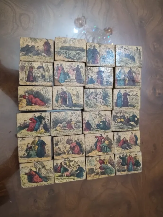 Detalles del productoConjunto de bloques de juguete antiguos con ilustraciones religiosas.