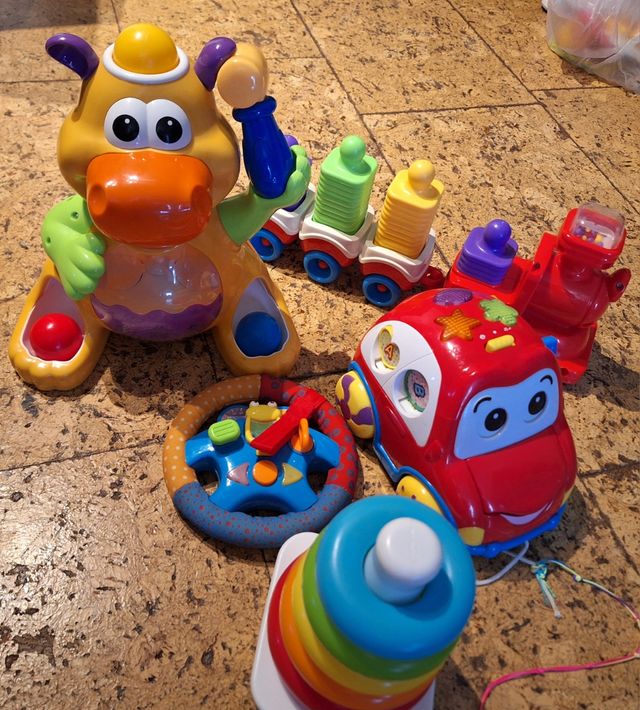 Detalles del productoSe vende lote de 5 juguetes para bebés de aproximadamente 1 año. Están en buen estado y son ideales para el desarrollo de la motricidad fina y gruesa.