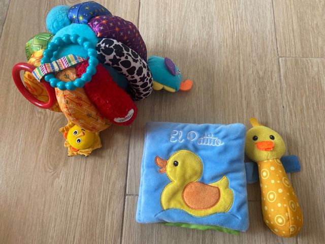 Juguete sensorial bebe con aros, figuras para descubrir y con sonajero. Libro suave de animales. La figura del pato pita. Usado por una sola bebe.