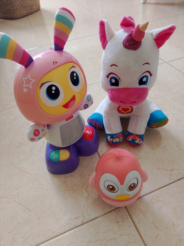 - Incluye un simpático unicornio de peluche, un robot musical y un gracioso pingüino.