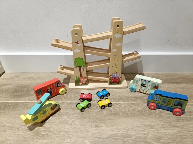 Conjunto de juguetes de madera para niños. - Rampa de madera para coches. - Set de vehiculos con imanes para poder intercambiar Tengo más juguetes en mi perfil