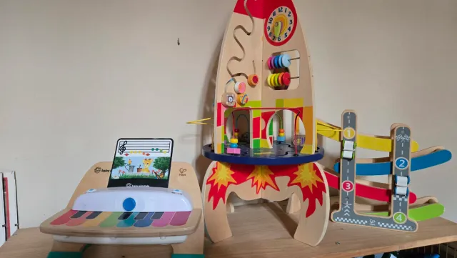 - Un centro de actividades con forma de cohete y laberinto de cuentas.