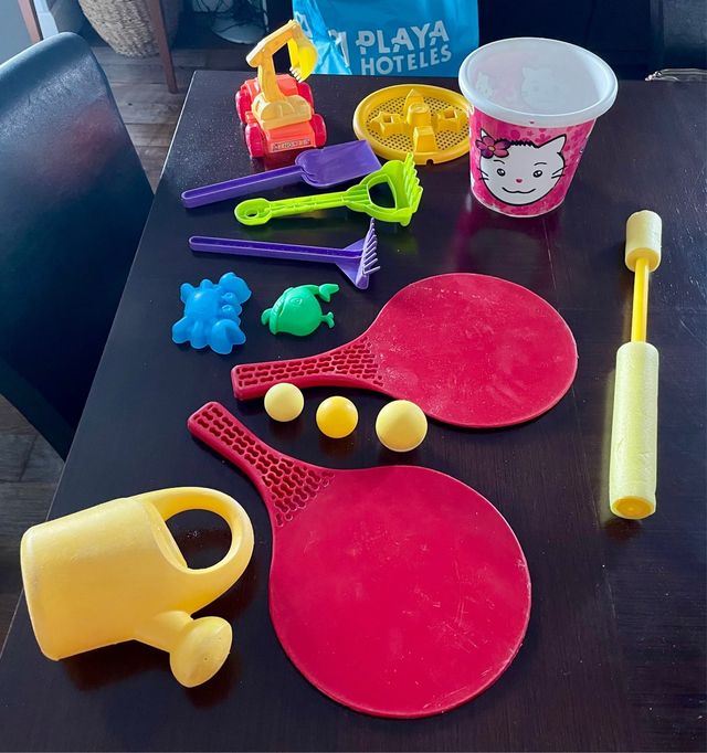 Detalles del productoJuego de juguetes de playa en buen estado. Incluye dos palas de playa de color rojo, un cubo rosa con diseño de gatita, una regadera amarilla, dos raquetas de playa, tres pelotas amarillas, un camión de juguete, una pala, un rastrillo, un molde de cangrejo azul, un molde de pez verde y una especie de pistola de agua. De regalo, una pelota de playa hinchable promocional. ¡Perfectos para la diversión en la arena!