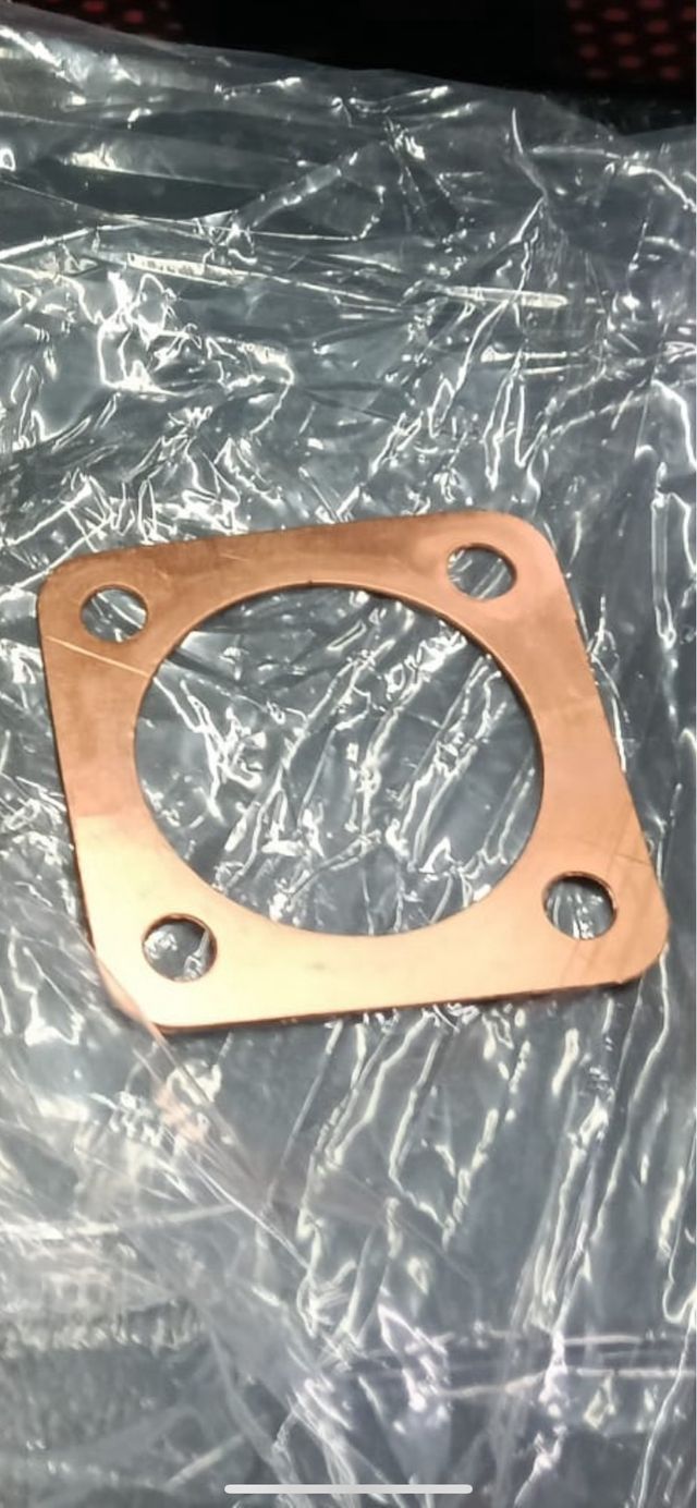 Junta de culata de cobre para Derbi Variant. - Material: Cobre. - Forma: Cuadrada con orificio central circular y cuatro orificios para tornillos.