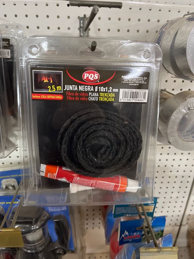 Junta negra trenzada de fibra de vidrio para chimeneas y estufas. - Longitud: 2.5 metros. - Medidas: 10x1.2 mm. - Incluye cola refractaria.