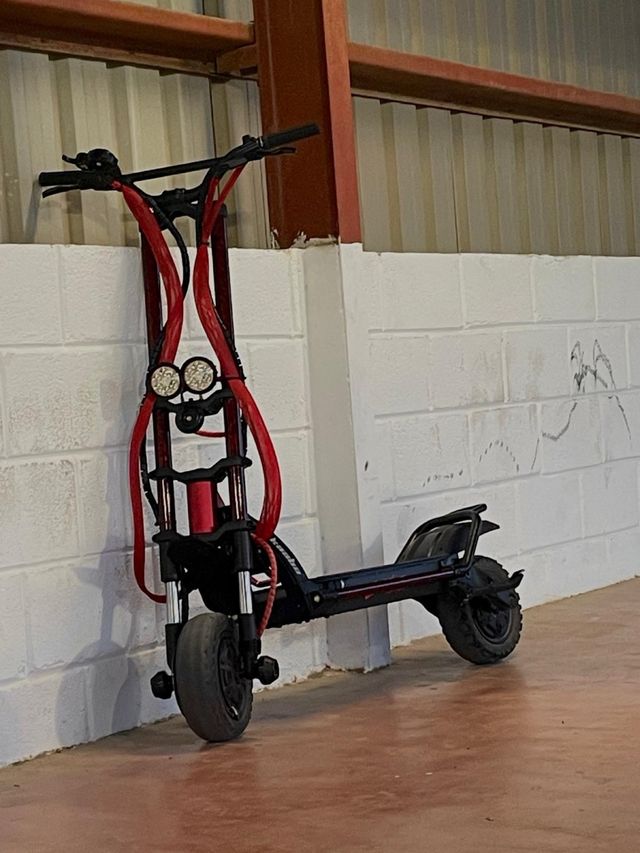Scooter eléctrico Kaboo Wolf King+ con un diseño llamativo en color rojo y negro. - Manillar ajustable. - Doble faro delantero. - Ruedas todoterreno.