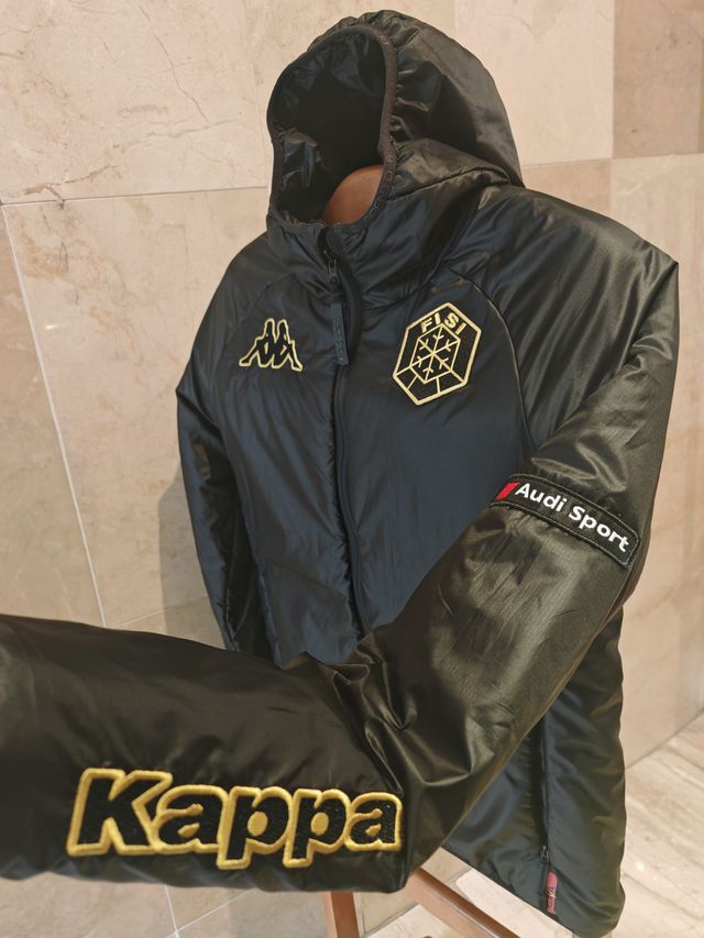 Chaqueta negra de la marca Kappa, con detalles de FISI y Audi Sport.