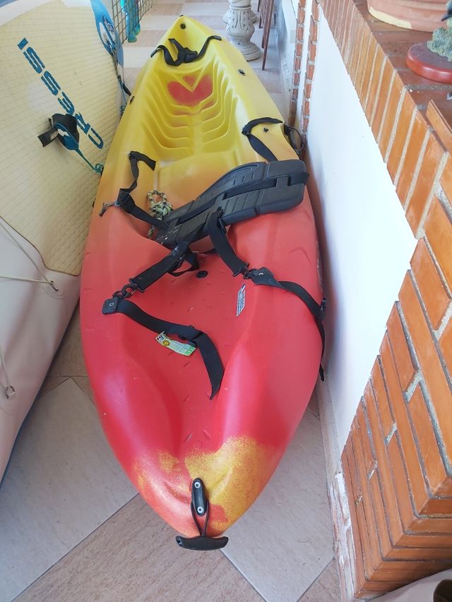 Kayak de una plaza, ideal para disfrutar del agua. - Diseño en dos tonos: amarillo y rojo. - Incluye asiento y correas de sujeción.y pala