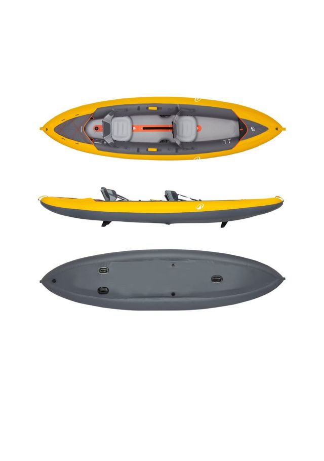 Kayak inflable de dos plazas en color amarillo y gris. Ha sido utilizado en dos ocasiones. - Diseño para dos personas. - Material resistente.
