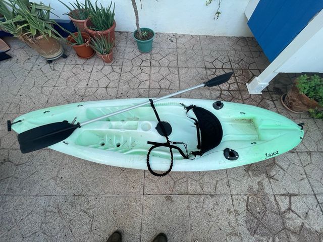 Kayak de recreo auto vaciable Mainstream Jazz. Incluye dos cañeros, un tambucho, remo, asiento acolchado y elástico para amarrar remo al kayak. 2,78x0,76m