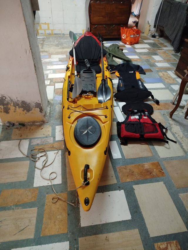 Kayak de pesca amarillo de 5 metros de eslora. Ideal para disfrutar de la pesca en aguas tranquilas. - Incluye dos remos. - Chaleco salvavidas. - Funda para equipo.