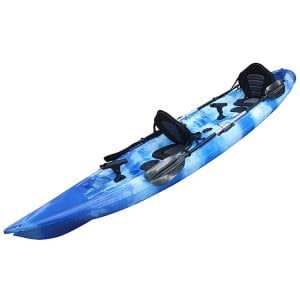 Kayak doble diseñado para la pesca, con un llamativo diseño en tonos azules y blancos. - Asientos cómodos. - Portacañas integrados. - Espacio de almacenamiento.