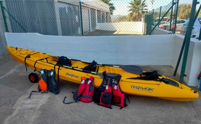 Detalles del productoKayak para 3 personas con sus 3 asientos, sólo 2 reman. Está en muy buen estado. Válido también para el mar. Muy cuidado y siempre guardado en garaje y endulzado.