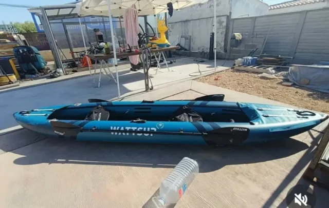 Detalles del productoKayak hinchable de color azul, ideal para disfrutar del agua.