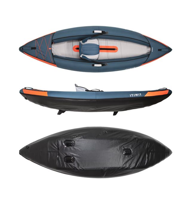Kayak hinchable ITIWIT para una persona. Poco uso. - Diseño en color azul y naranja. - Asiento incluido. - Kit completo: Bolsa, Remos, Hinchador