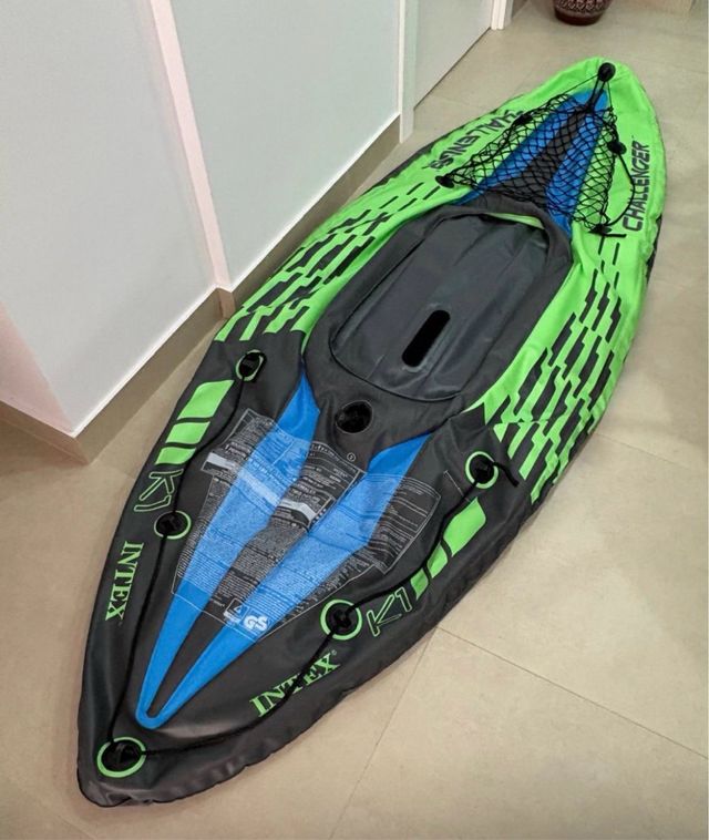 Detalles del productoKayak inflable Intex Challenger K1, ideal para aventuras acuáticas. Su diseño llamativo en verde y azul lo hace destacar.