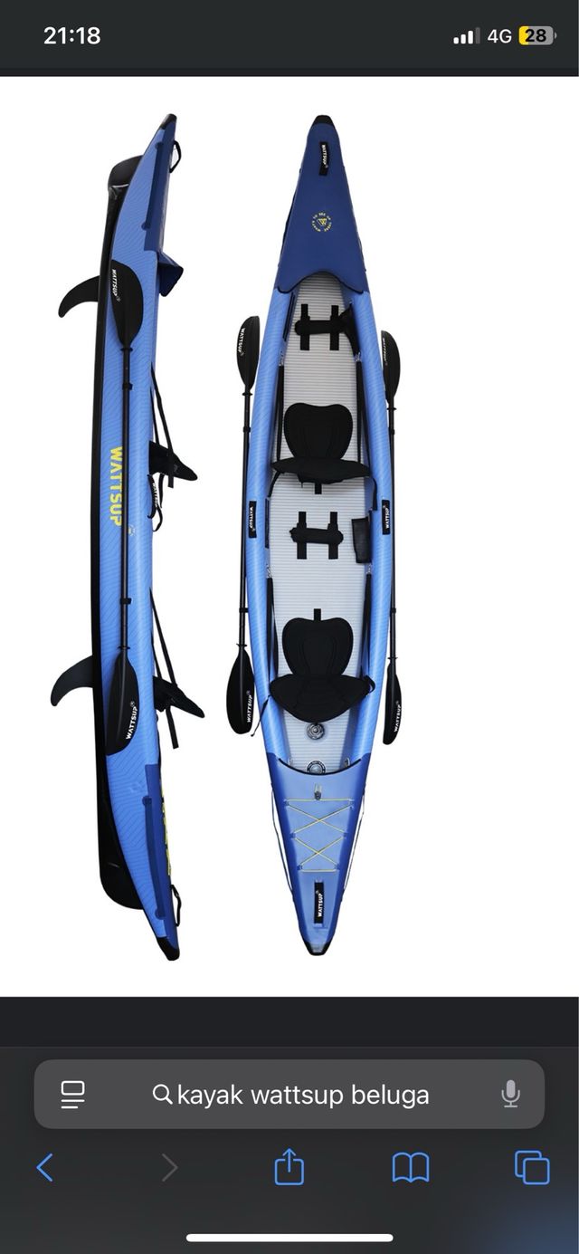 Detalles del productoKayak inflable de la marca Wattsup, modelo Beluga, con capacidad para dos personas. Ideal para disfrutar del agua.