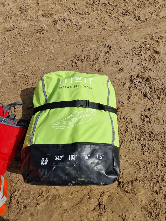 Detalles del productoKayak itiwit x100 para dos personas con su bolsa de transporte en un excelente estado ,3 orzas 2 asientos 2 remos e inflador de 5,2 litros doble acción,usado en playa, tiene 4 años y 3 ó 4 usos por año ,Endulzado despues de cada salida solo venta en persona