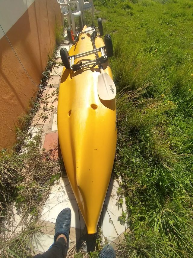 Detalles del productoKayak Prowler 13 de color amarillo, ideal para aventuras acuáticas. Incluye carrito para transporte y remo.
