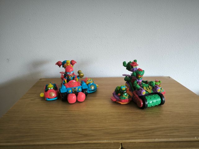 Pareja de coches de juguete Kazoom, en buen estado. - Incluye dos vehículos con figuras. - Colores vistosos y diseño llamativo. - Perfectos para juegos infantiles.