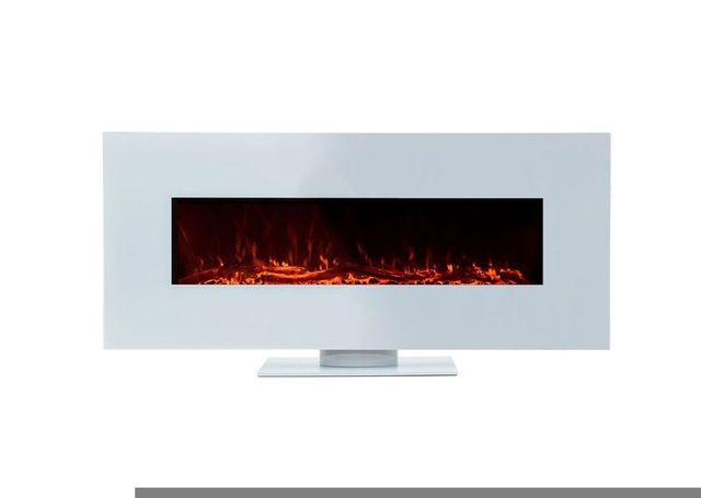 Chimenea eléctrica de diseño tipo mural con frontal de cristal templado blanco y con simulación de fuego en su interior para calentar una estancia sin renunciar a la estética