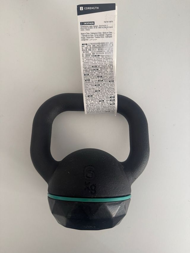 Detalles del productoKettlebell de la marca Corength de Decathlon, con un peso de 6 kg. Ideal para entrenamientos de fuerza y cross training.