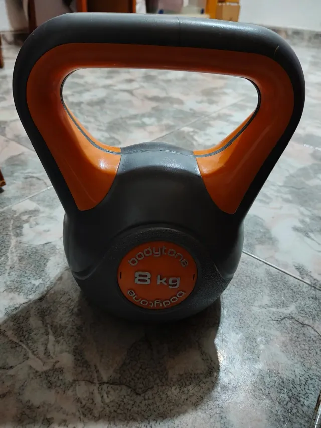 Detalles del productoKettlebell de la marca Bodytone con un peso de 8 kg. Su diseño combina el color gris oscuro con detalles en naranja vibrante, lo que le da un aspecto moderno y distintivo.