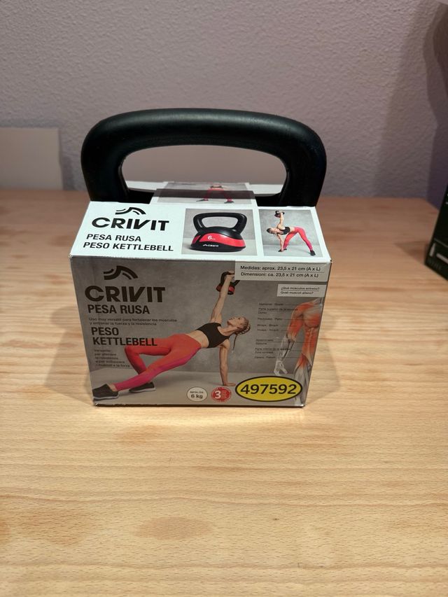 Detalles del productoPesa rusa Crivit de 6 kg, ideal para entrenamientos de fuerza y resistencia.